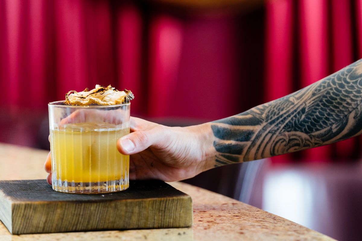 Patron Reposado Tequila, La Goya Manzanilla Sherry, Malibu, Caramelised Pineapple Syrup, Milk Whey, Coconut, Agave, Lime & Toasted Pineapple
